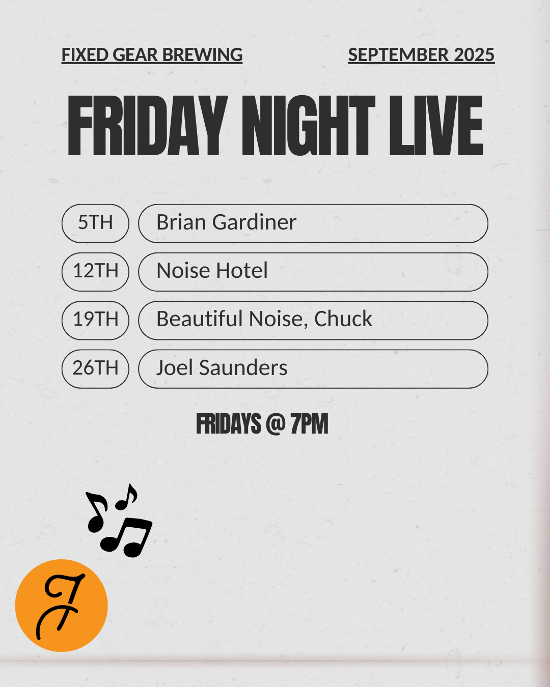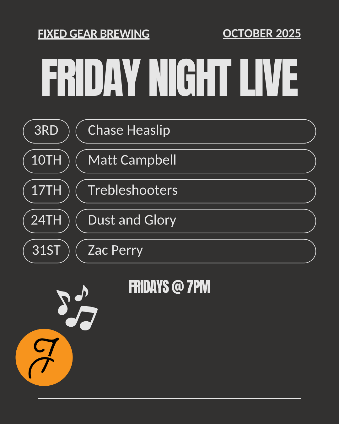 Here’s what’s happening this week, plus a peek at this month’s music lineup! 🎶 Both schedules are subject to change, so check our instagram (@fixed_gear_brewing) for updates.