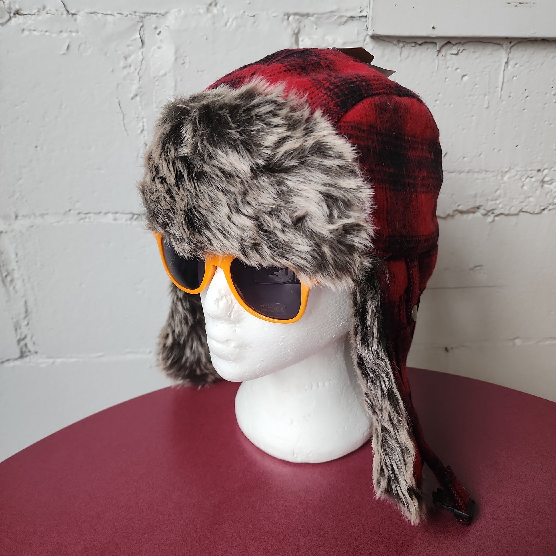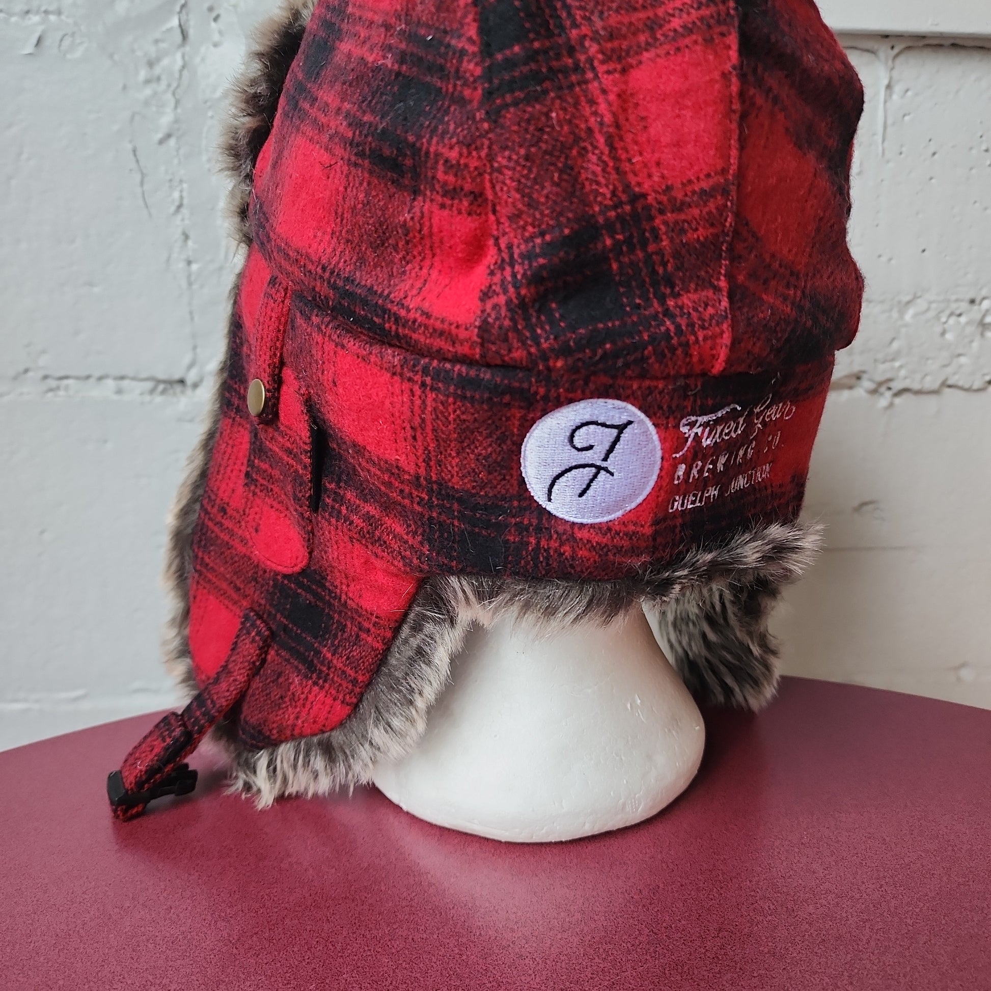 Black and red plaid aviator hat with faux fur trim and Fixed Gear logo.